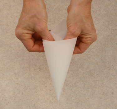 - Cut the pointed end of the cone so that when a tip is dropped into the cone, the bottom 1/3 of the tip is showing. The tip of the bag should be very tight.