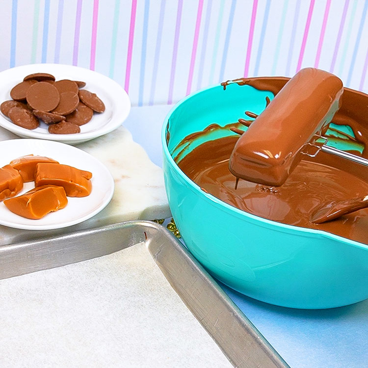 10. Using a dipping tool, dip each caramel cookie into the melted coating.
