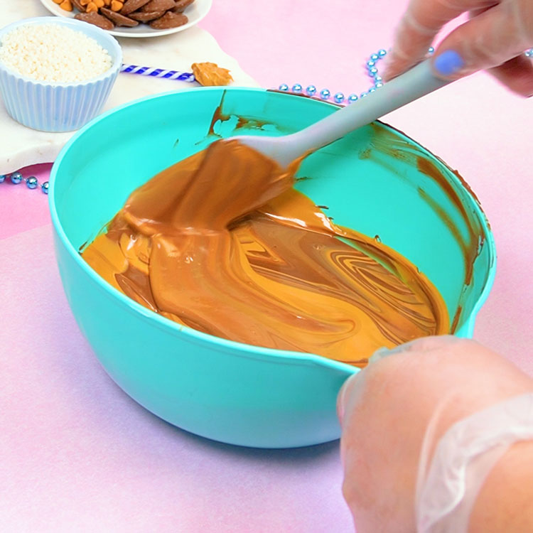 Once melted, add the paramount crystals to the melted butterscotch and mix to combine (this helps the butterscotch remain smooth and mix well with the milk chocolate). Set aside a small amount of each chocolate for decoration.