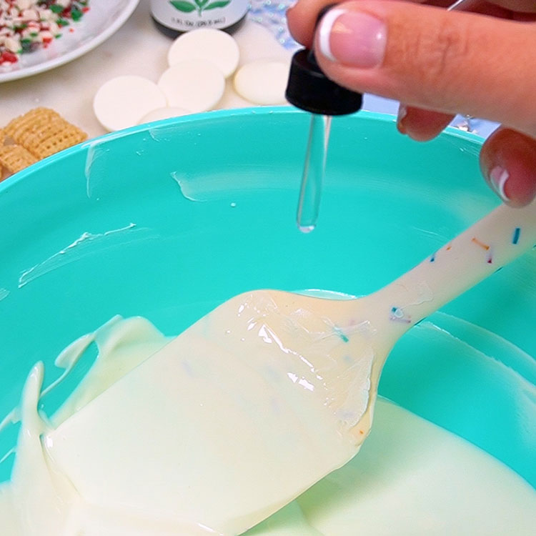 Melt the white chocolate in the microwave, then stir in the peppermint oil and peppermint crunch.