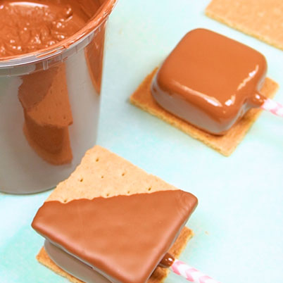 Then, place one of the graham crackers that were dipped in chocolate on top and gently press down. Your final product should look like a s'more on a stick. Continue until all s’mores are created. Let dry on parchment paper for 10-15 minutes or until chocolate is completely set.