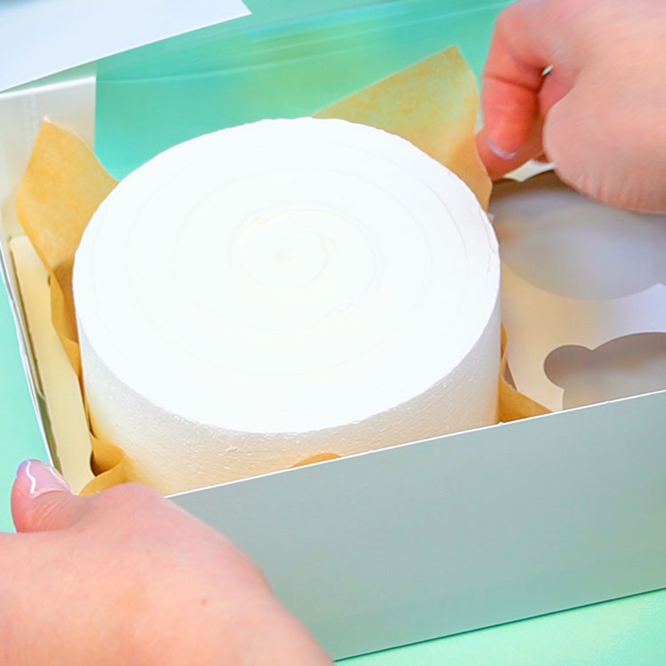 At this point, your cake should be cold enough to work with. Carefully transfer your frosted cake an 8" x 10" piece of kraft brown parchment paper & set into the prepped Bento Box. Adjust the parchment paper as needed.