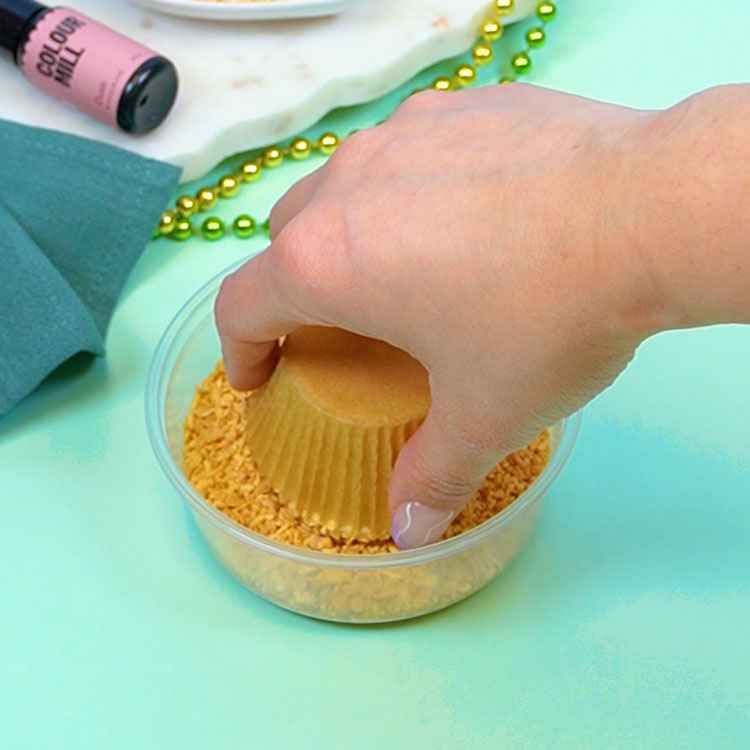 Immediately, dip the freshly piped cupcake into a bowl of coconut candy crunch. Use clean hands to gently form the frosting in a perfect round shape.