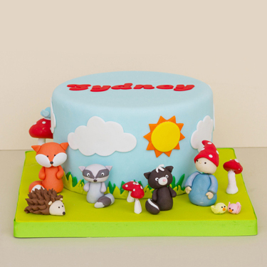 Roll light blue fondant to desired thickness and cover the cake. Place cake on the back of the board leaving plenty of room for the creatures in the front. Roll other fondant thin and cut clouds, sun and grass using Nature Cutter Set. Apply pieces to cake with piping gel. Cut letters from alphabet cutters and apply to cake using piping gel. Place creatures on top of lime green fondant using piping gel to secure them.