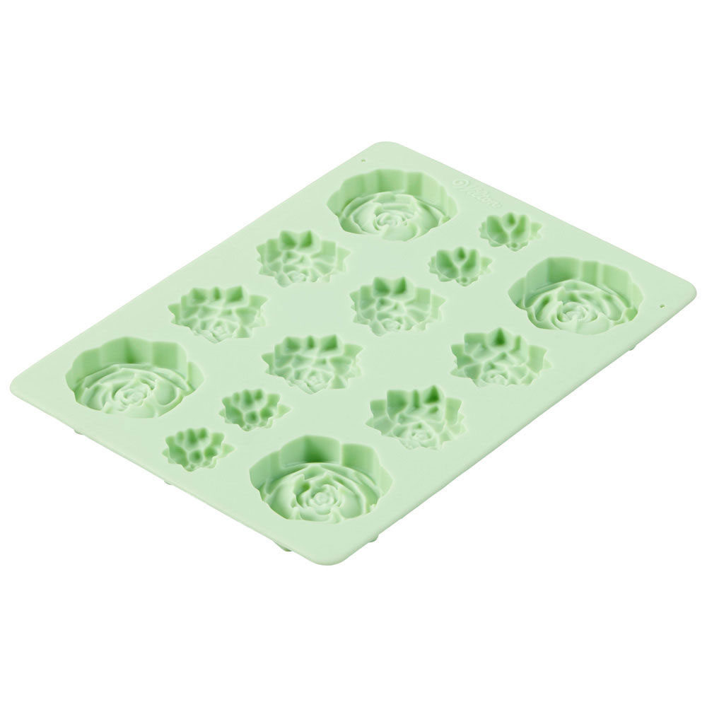 Succulent mold can be used with chocolate, hard candy, gummie candy, fondant, and more. Mold has 14 cavities and three different sizes of succulents. Approximately 42 pieces can be made from one pound of chocolate or candy coating.