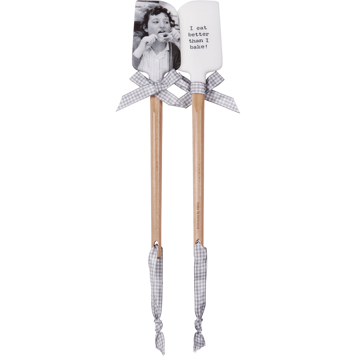 A double-sided silicone spatula features a vintage photograph on one side, and "I Eat Better Than I Bake!" sentiment on the other side. Handles feature laser cut logos and drilled hole with ribbon loop for easy hanging. Heat resistant up to 375 degrees Fahrenheit. Hand-wash recommended. Not microwave safe.