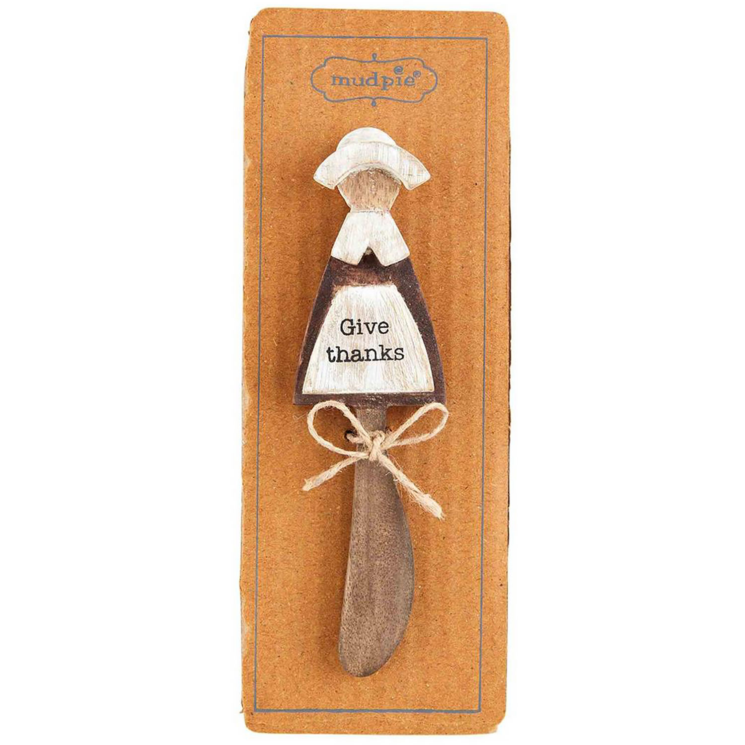 This festive pilgram topped mango wood spreader is perfect for your holiday table.