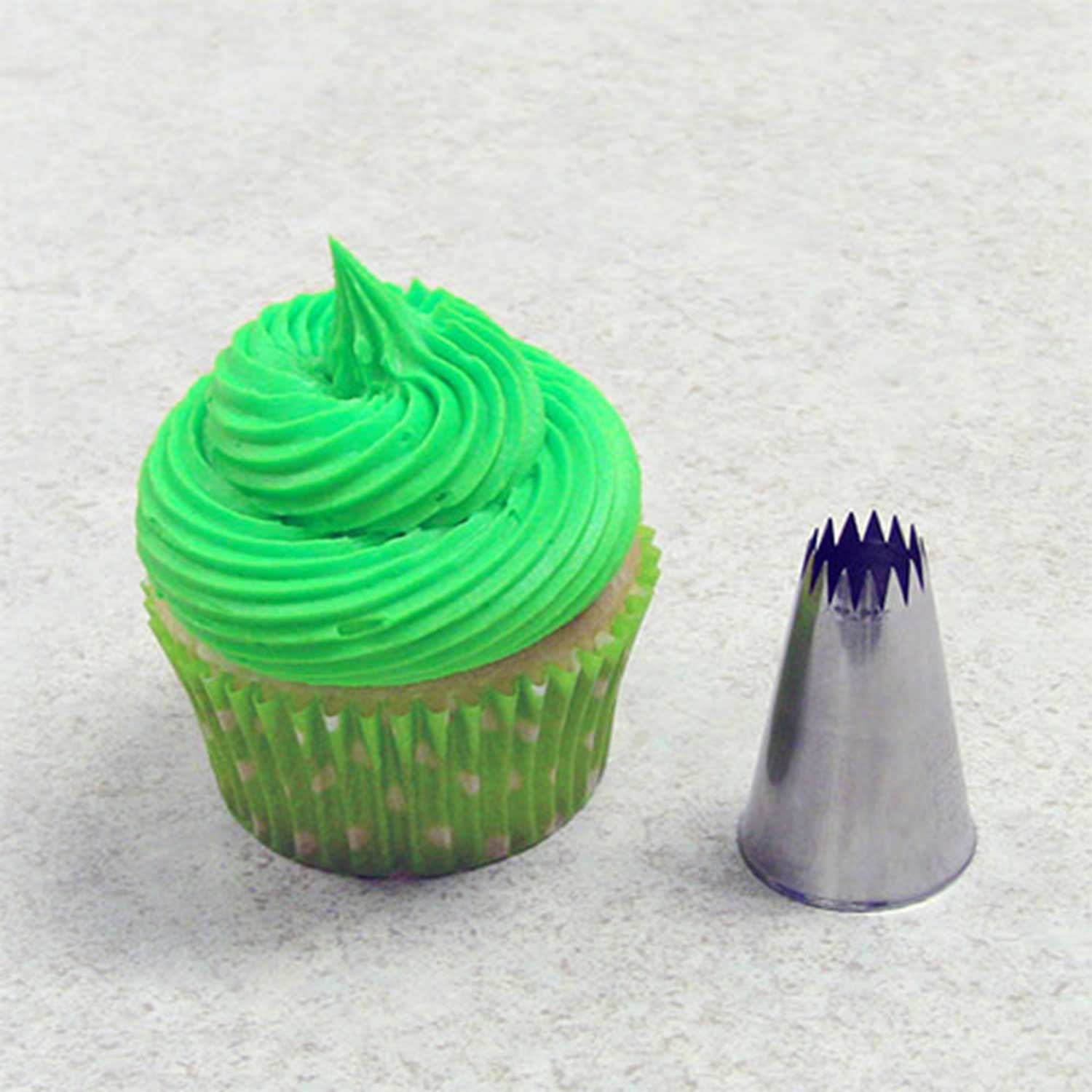 Open 'teeth' tip for piping shell borders, reverse shell borders, drop flowers, zigzags, ropes, and stars. Large open star tips can be used to create swirls on the tops of cupcakes.