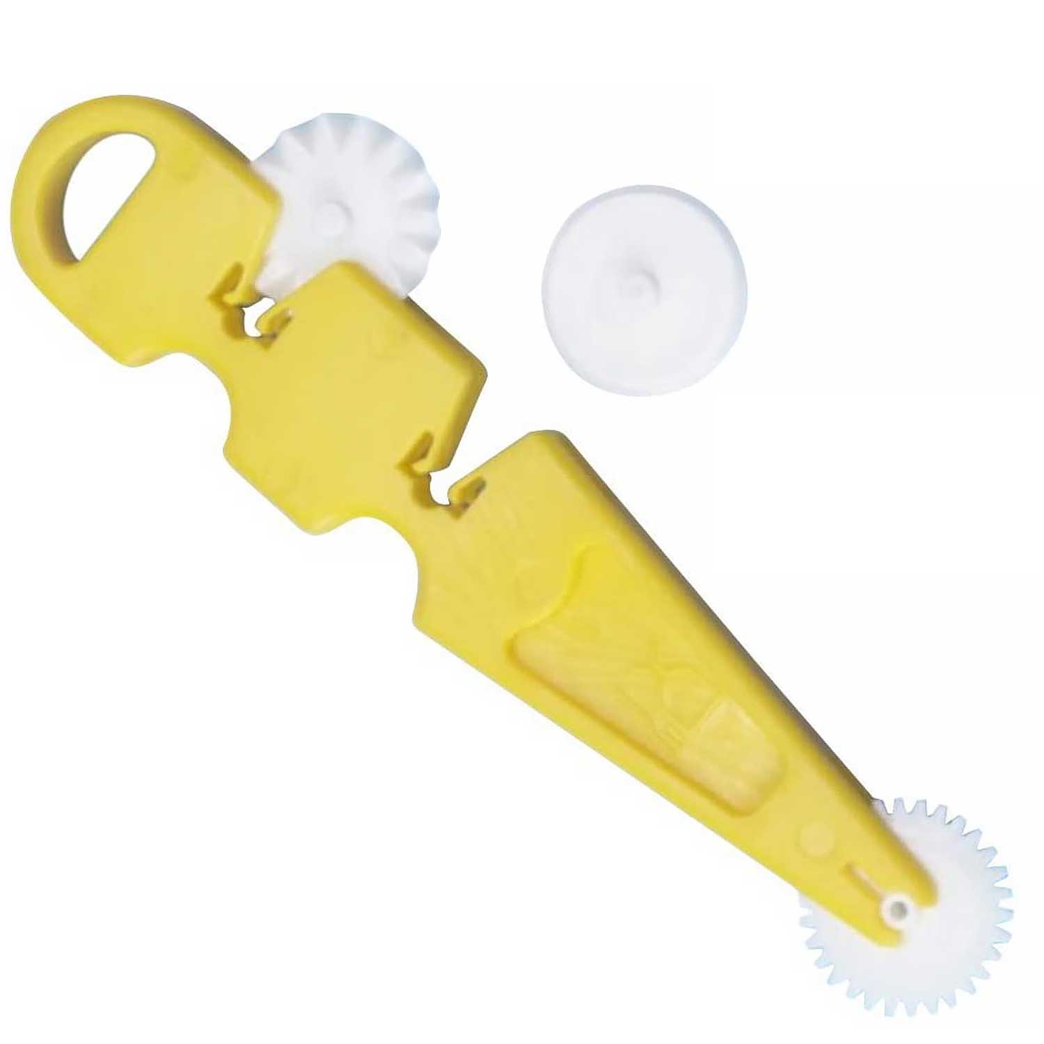 5" This modelling tool is ideal for use with a wide range of products including fondant and gumpaste. Select the appropriate wheel to create stitching, quilting and creative designs. Includes 3 interchangeable wheels to allow for different designs. Store extra wheels in handle.