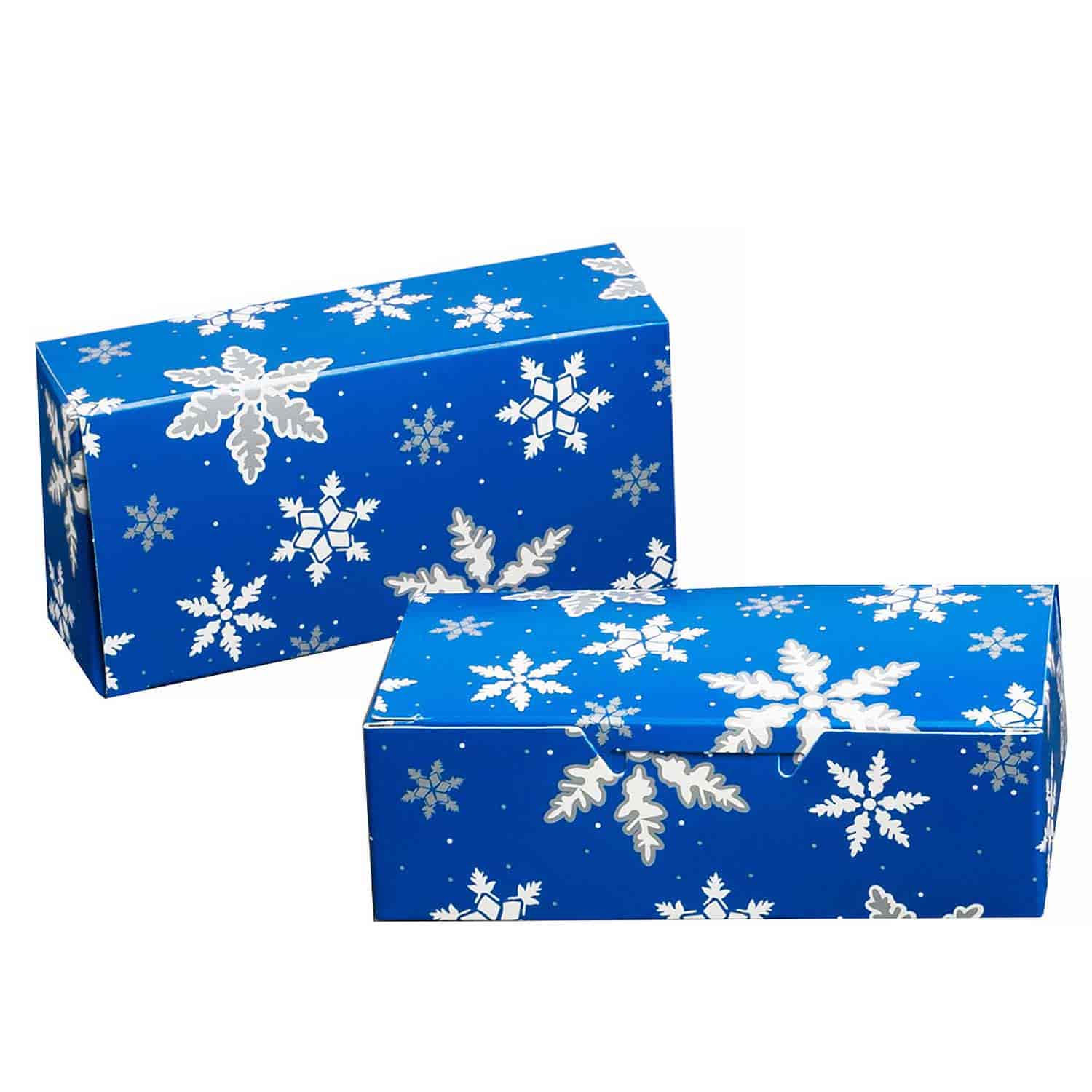 The snowflakes on this box come in varying shapes and colors. Some are solid white, others are solid silver and the rest are a combination of white and silver. The background of the box is blue. This is a one piece folding box that will require minimal assembly.
