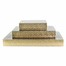This is a two piece assembled box with a gold cardboard base and a clear plastic lid. Base is covered with a patterned gold foil.