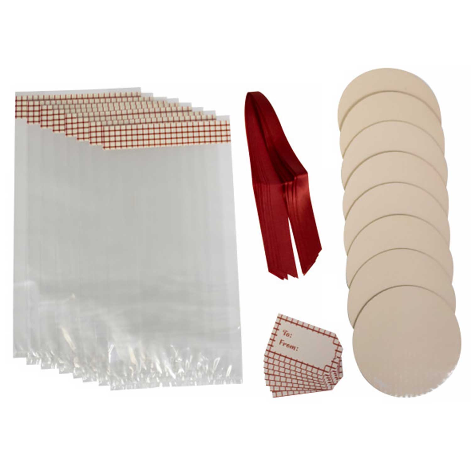 Homemade caramel apples never looked so good! This treat bag kit gives you everything you need to dress yours up. Cardboard plates keep them standing upright in the clear top print bags; just personalize the tags, tie on with ribbons, and you're ready to go. Includes 8 complete kits.
