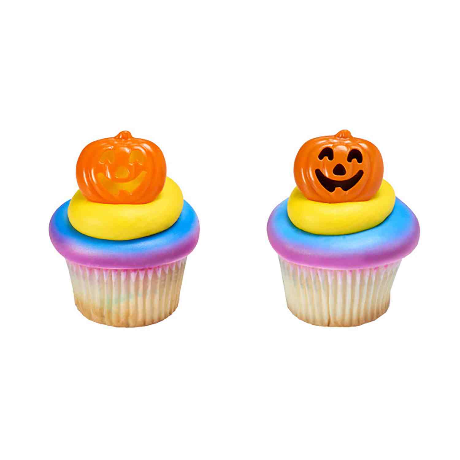 Add to your Halloween dessert display these fun Jack-o-Lantern rings. Assortment includes yellow and black faces. Great for cupcakes, donuts, or even finish off the look of a cake. Made with food-safe plastic.